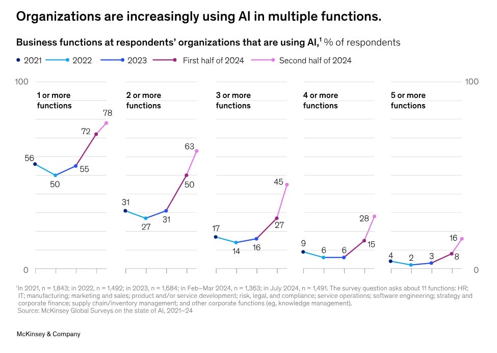 78% of respondents to a recent McKinsey survey said they use AI in at least one business function, up from 55% a year before. That’s impressive - but one business function is one of many. AI has a long way to go before it’s as ubiquitous as email.