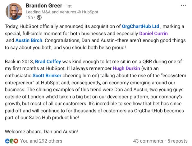 Yesterday, HubSpot announced they’re acquiring OrgChartHub. Dan and Austin - the two co-founders and sole employees of OrgChartHub - are joining the HubSpot Sales Hub team. I couldn’t be happier for them. They’re super humble, super smart guys.
